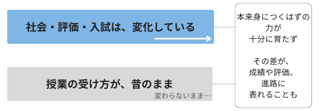 世の中や仕事で求められる能力が変わり、それに合わせて、学習指導要領、学校の授業、評価、入試制度も大きく変わっています。