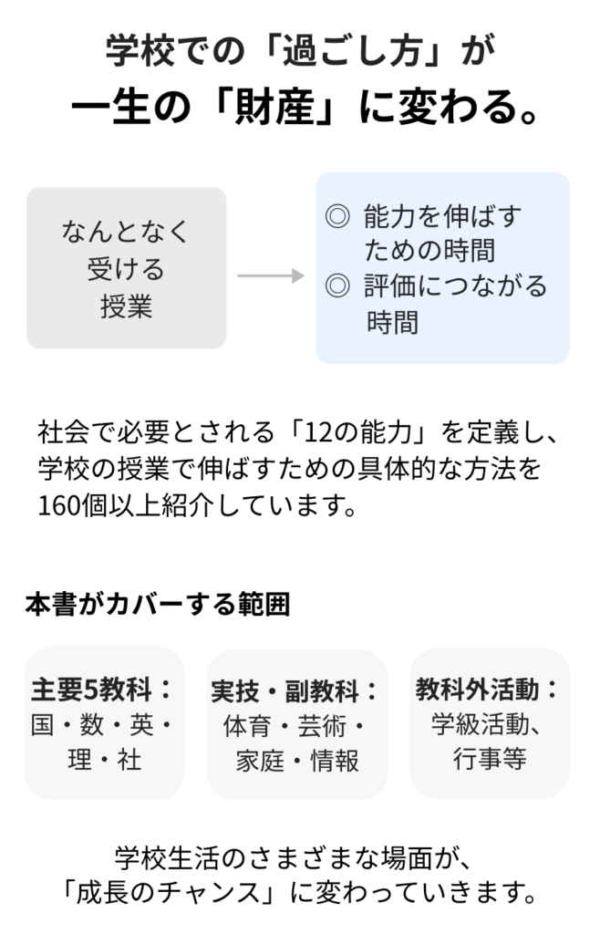本書では、社会で必要とされる「12の能力」を定義し、それらを学校の授業で伸ばすための具体的な方法を、160個以上(シリーズ累計)紹介しています。